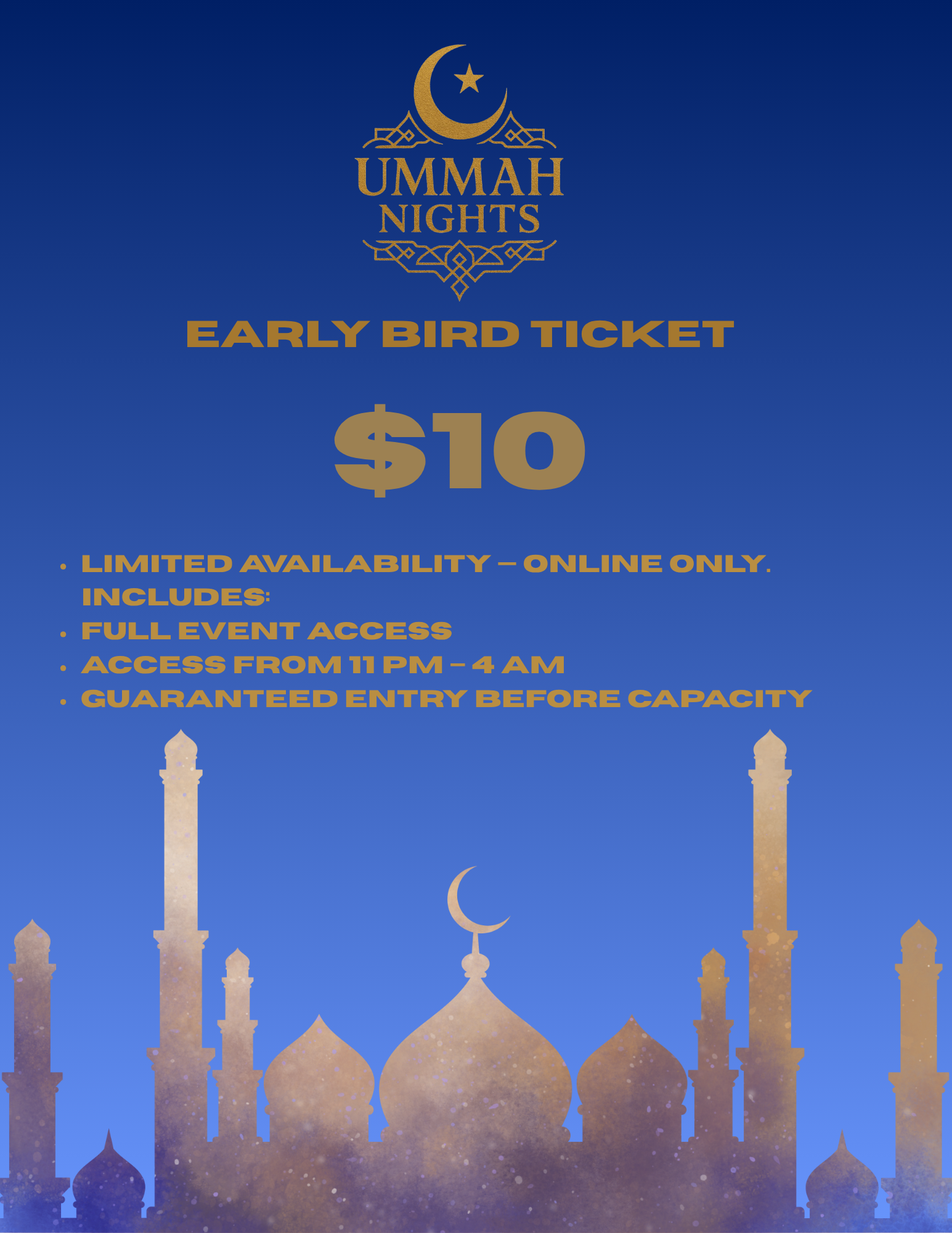 Get 30-minute early access, a free Ummah Nights T-shirt, and free general parking.